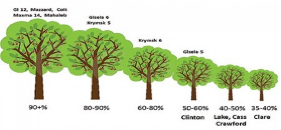 Από τα πρώτα στοιχεία ξεχώρισαν οι περιπτώσεις του Clare, που είναι χαρακτηριστικά χαμηλότερης ζωηρότητας ακόμη και από το Gisela 5, το Clintonκαι το Crawford, που δημιουργούν ευρείες γωνίες διακλάδωσης που τα καθιστά εύκολα διαχειριζόμενα όσον αφορά τη διαμόρφωση των δένδρων. Τα Cassκαι Lake φαίνεται να ευνοούν τη διαμόρφωση του δένδρου σε σύστημα UFO.