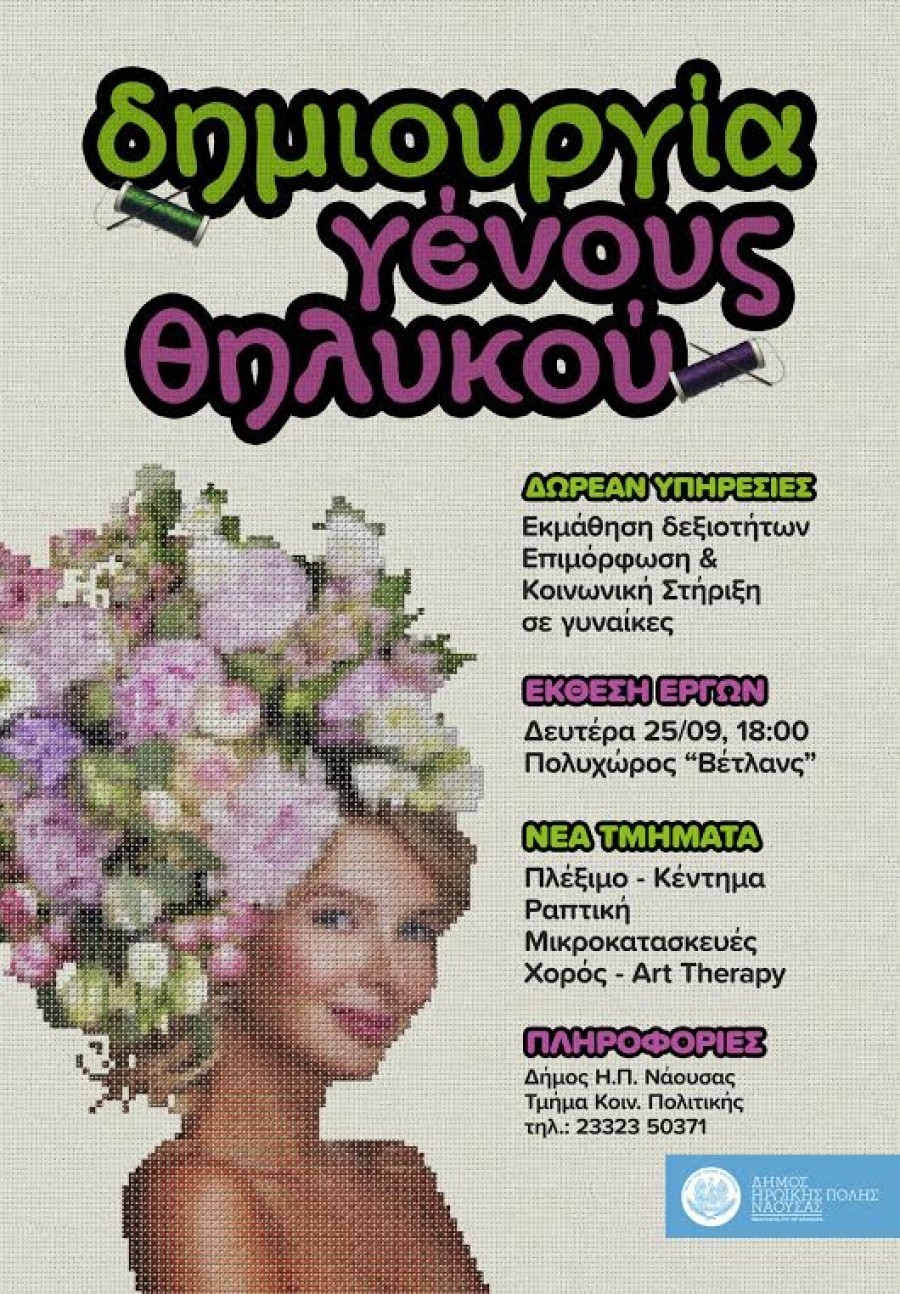 Ο δήμος Νάουσας ξεκίνησε το πρόγραμμα δραστηριοτήτων «Δημιουργία Γένους Θηλυκού», το οποίο παρέχει δωρεάν υπηρεσίες εκμάθησης δεξιοτήτων, επιμόρφωσης και προγραμμάτων κοινωνικής στήριξης σε γυναίκες. Το πρόγραμμα έχει ξεκινήσει με δύο δραστηριότητες, το Κέντημα και το Πλέξιμο, όπου υπήρξε πολύ μεγάλη ανταπόκριση των γυναικών.
