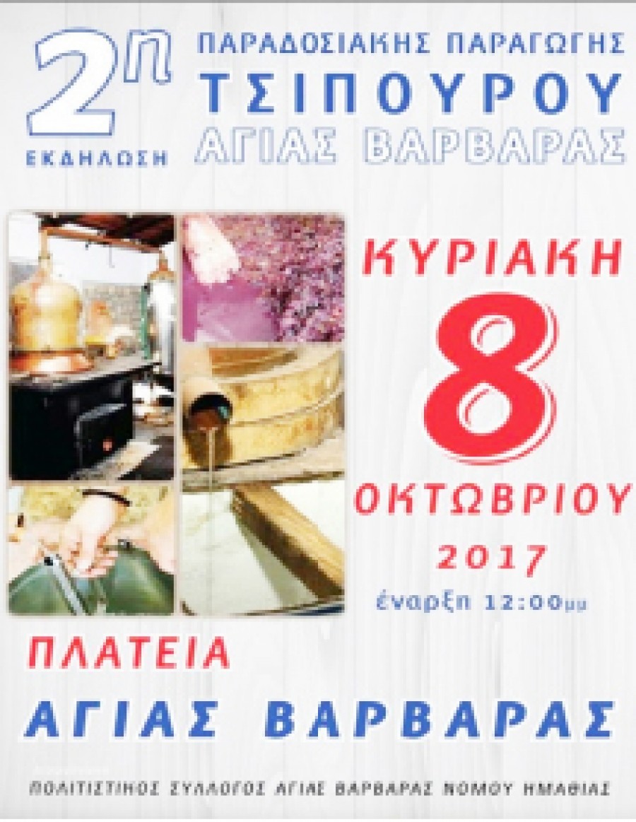 Ο Πολιτιστικός Σύλλογος Αγίας Βαρβάρας Ν. Ημαθίας, διοργανώνει την 2η Εκδήλωση Παραδοσιακής Παραγωγής Τσίπουρου Αγίας Βαρβάρας, την Κυριακή 8 Οκτωβρίου 2017 με ώρα έναρξης 12:00π.μ. στην πλατεία της Αγίας Βαρβάρας Βέροιας.