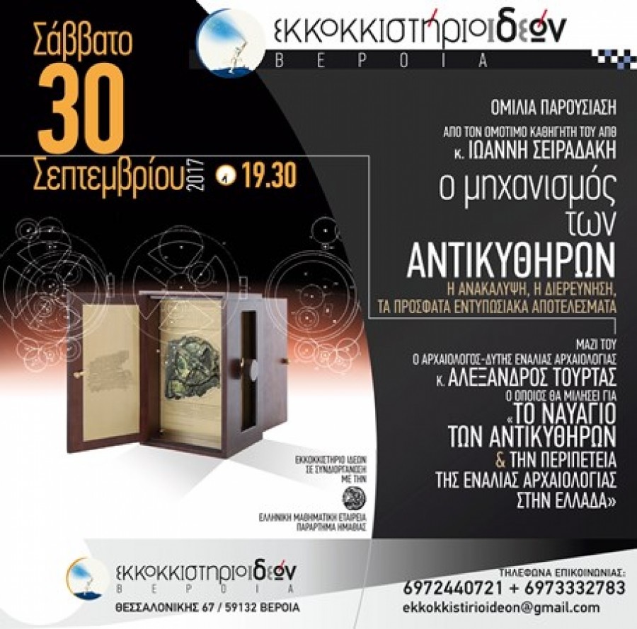 Μια ενδιαφέρουσα ενημέρωση την ανακάλυψη του Μηχανισμού, την διερεύνηση, των πρόσφατων εντυπωσιακών αποτελεσμάτων και την περιπέτεια της ενάλιας αρχαιολογίας στην Ελλάδα, θα κάνουν ο ομότιμος καθηγητής του Α.Π.Θ κ. Γιάννης Σειραδάκης ο Αρχαιολόγος-Δύτης στο Ναυάγιο των Αντικυθήρων κ. Αλέξανδρος Τούρτας, στο ΕΚΚΟΚΚΙΣΤΗΡΙΟ ΙΔΕΩΝ, στην οδό Θεσσαλονίκης 67 στη Βέροια.
