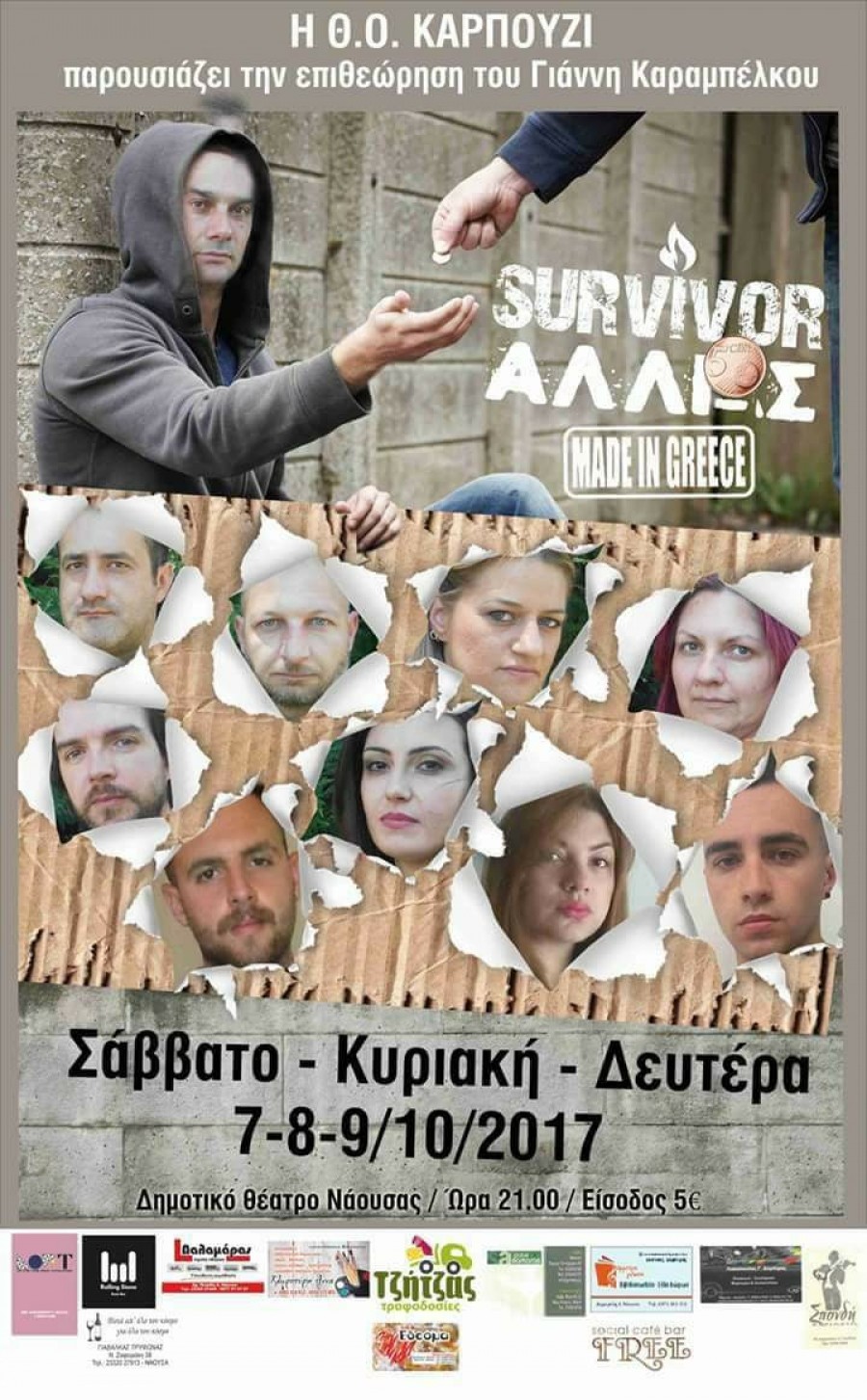 Την κωμωδία ΄Survivor αλλιώς… made in Greece΄, του αστείρευτου Γιάννη Καραμπέλκου, παρουσιάζει 7 με 9 Οκτωβρίου στο δημοτικό θέατρο η θεατρική ομάδα ΄Καρπούζι΄, μετά από απαίτηση του θεατρόφιλου κοινού.