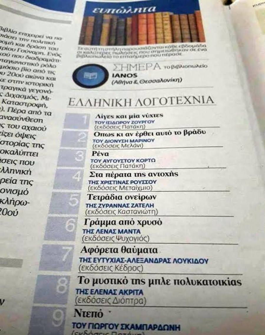 Τέταρτο σε πωλήσεις ήταν την περασμένη εβδομάδα το βιβλίο ΄Στα πέρατα της αντοχής΄ της Ημαθιώτισσας συγγραφέα Χριστίνας Ρούσσου, σύμφωνα με τα στοιχεία του βιβλιοπωλείου ΄Ιανός΄. Πράγματι μεγάλη διάκριση και επιτυχία για τη Ναουσαία συγγραφέα και το δεύτερο βιβλίο της (μετά την ΄Ντουλμπέρα΄).