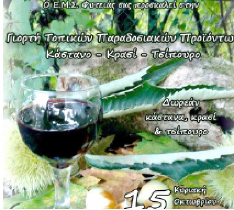 Ο Εκπολιτιστικός Μορφωτικός Σύλλογος Φυτειάς σας προσκαλεί στην 1η Γιορτή Παραδοσιακών Προϊόντων, που θα πραγματοποιηθεί την Κυριακή 15 Οκτωβρίου και ώρα 11.00 πμ. στην τοποθεσία Τρανό Πηγάδι, στη Φυτειά Ημαθίας.