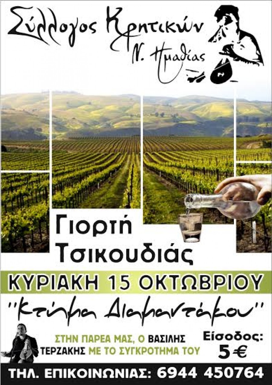 Την 11η Γιορτή Τσικουδιάς διοργανώνει την ερχόμενη Κυριακή στις 12.30 το μεσημέρι ο Σύλλογος Κρητικών Ημαθίας, στο Κτήμα Διαμαντάκου στη Νάουσα. Στη παρέα ο Βασίλης Τερζάκης με το συγκρότημά του.