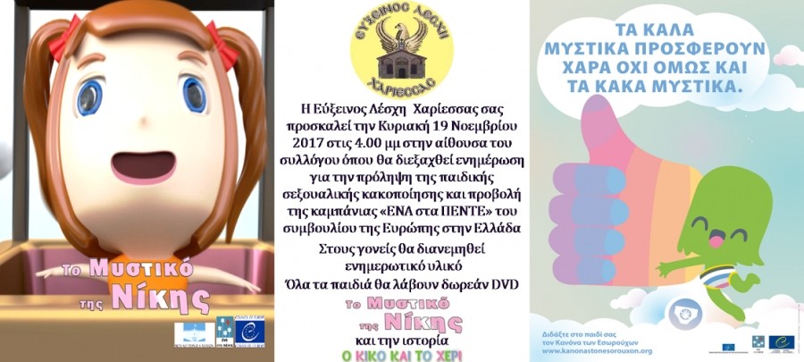 Εκδήλωση ενημέρωσης για την πρόληψη της παιδικής σεξουαλικής κακοποίησης και προβολή της καμπάνιας «ΕΝΑ στα ΠΕΝΤΕ» του συμβουλίου της Ευρώπης στην Ελλάδα, θα γίνει την Κυριακή στις 4 το απόγευμα από την Εύξεινος Λέσχη Χαρίεσσας στην αίθουσα του συλλόγου. Στους γονείς θα διανεμηθεί ενημερωτικό υλικό ενώ όλα τα παιδιά θα λάβουν ΔΩΡΕΑΝ DVD «Το Μυστικό της Νίκης» και την ιστορία «Ο ΚΙΚΟ και το ΧΕΡΙ»