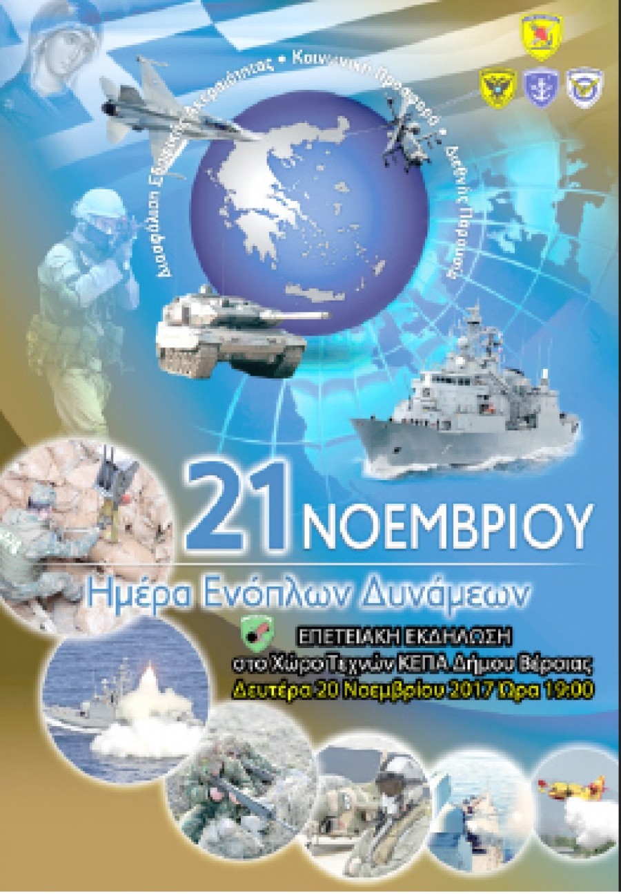 Στο πλαίσιο εορτασμού της Ημέρας των Ενόπλων Δυνάμεων – Απόστρατου/Βετεράνου και σε συνέχεια προγραμματισμένων επετειακών δράσεων – πολιτιστικών εκδηλώσεων της Μεραρχίας, για τον εορτασμό των 120 χρόνων από ιδρύσεώς της (19 Μαρτίου 1897), θα πραγματοποιηθεί εκδήλωση, τη Δευτέρα 20 Νοεμβρίου 2017 στις 7:00 μ.μ. στο Χώρο Τεχνών Βέροιας.