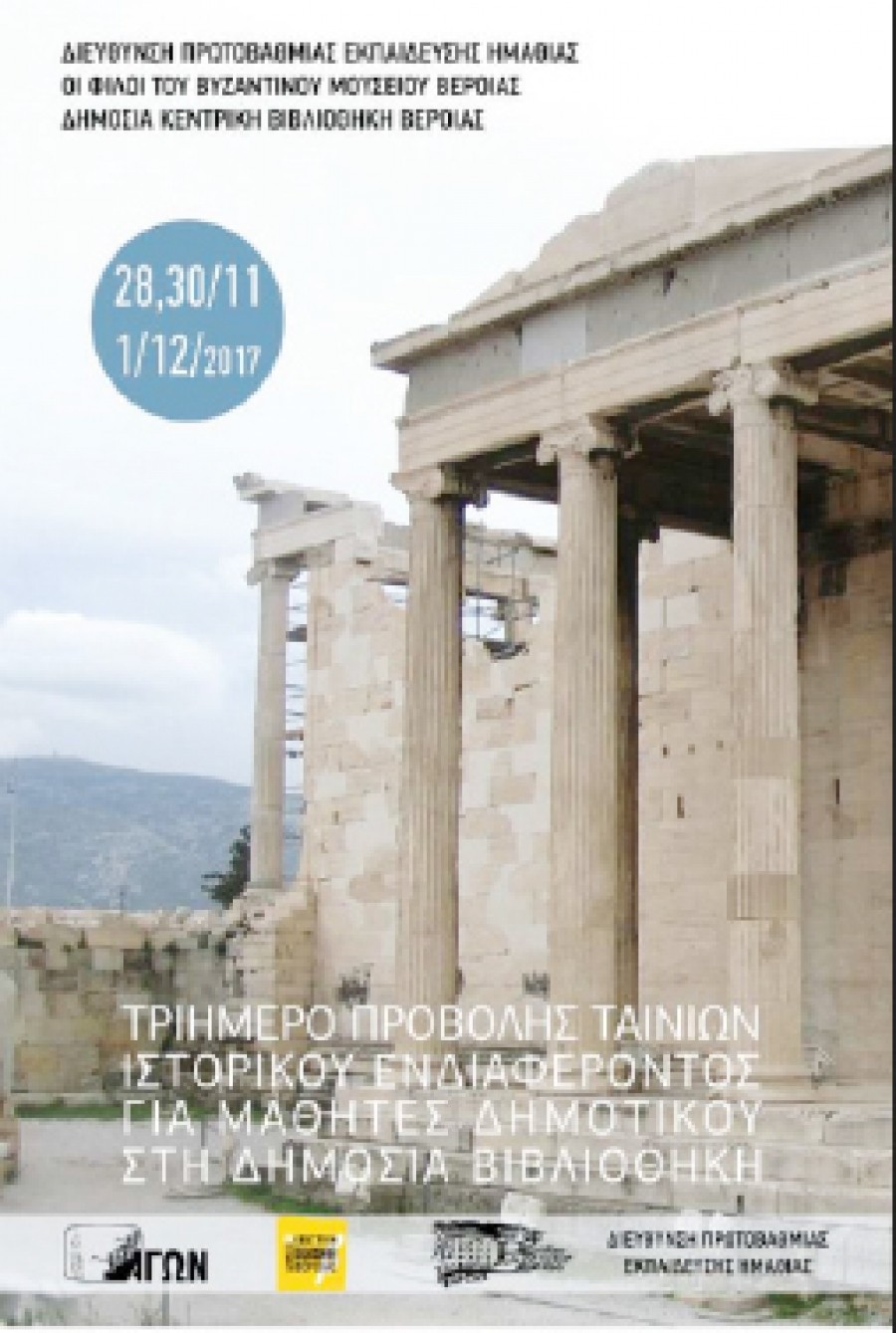 Οι Φίλοι του Βυζαντινού Μουσείου Βέροιας, η Δημόσια Κεντρική Βιβλιοθήκη Βέροιας και η Διεύθυνση Πρωτοβάθμιας Εκπαίδευσης Ημαθίας οργανώνουν στη Βέροια, τριήμερο προβολής ταινιών ιστορικών θεμάτων, στις 28, 30 Νοεμβρίου και 1 Δεκεμβρίου 2017.