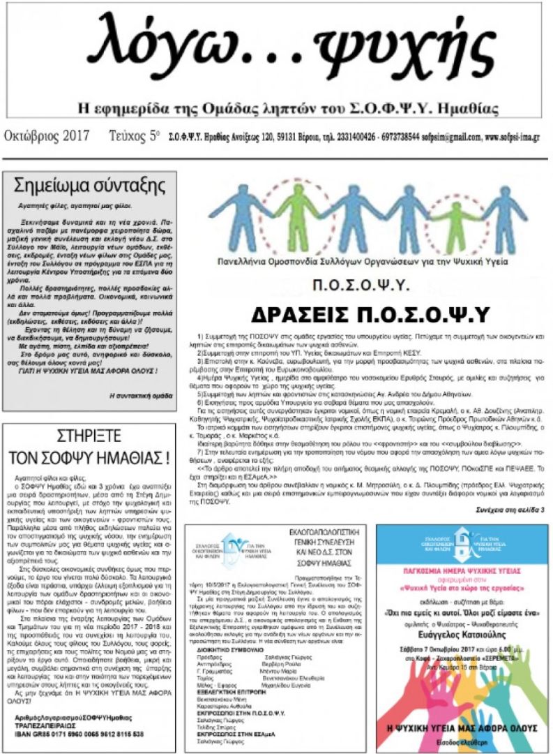 Επιστέγασμα της σωστής λειτουργίας των Ομάδων Ληπτών ψυχικής υγείας και υποστήριξης οικογενειών είναι η έκδοση της εφημερίδας του Σ.Ο.Φ.Ψ.Υ. με τίτλο «λόγω… ψυχής» όπου προβάλλονται όλες οι δραστηριότητες του Συλλόγου. Ήδη έχουν εκδοθεί 5 φύλλα της εφημερίδας.