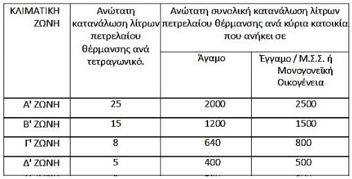 3. Για κάθε κατοικία, ανεξαρτήτως ζώνης, χορηγείται επίδομα σε άγαμους για τα πρώτα 80 τετραγωνικά μέτρα και για τα πρώτα 100 μέτρα για τους έγγαμους και τις μονογονεϊκές οικογένειες, με ανώτατη κατανάλωση πετρελαίου θέρμανσης ανά κλιματική ζώνη και ανά τετραγωνικό ως ακολούθως: