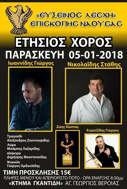 Τον ετήσιο χορό της πραγματοποιεί Παρασκευή 5 Ιανουαρίου στο Κτήμα Γκαντίδη (Άγιος Γεώργιος) η η Εύξεινος Λέσχη Επισκοπής Νάουσας. Θα παρουσιαστούν τα τμήματα του συλλόγου!
