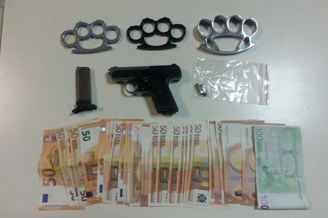 ποσότητα κάνναβης βάρους 2 κιλών και 249 γραμμαρίων, ένα πιστόλι με 2 φυσίγγια και γεμιστήρα, 3 σιδερογροθιές, μία ηλεκτρονική ζυγαριά ακριβείας και 1.500 ευρώ.