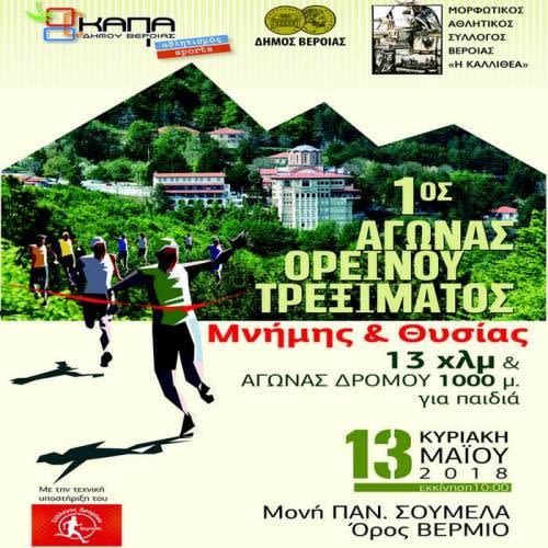 Ο Μορφωτικός Αθλητικός Σύλλογος “Η Καλλιθέα” Βέροιας σε συνεργασία με το ΚΑΠΑ του Δήμου Βέροιας και την τεχνική υποστήριξη του Συλλόγου Δρομέων Βέροιας, ανακοινώνει την διεξαγωγή του 1ου Αγώνα Ορεινού Τρεξίματος “ΜΝΗΜΗΣ ΚΑΙ ΘΥΣΙΑΣ”, 13χλμ την Κυριακή 13 Μαΐου 2018.