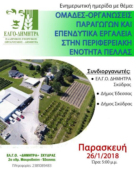 εκδήλωση θα πραγματοποιηθεί στις εγκαταστάσεις του ΕΛ.Γ.Ο. «ΔΗΜΗΤΡΑ» Σκύδρας (Μαυροβούνι)