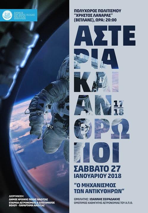 Ένας από τους πιο ειδικούς στον κόσμο για τον Μηχανισμό των Αντικηθύρων, ο ομότιμος καθηγητής ΑΠΘ Γιάννης Σειραδάκης, θα μιλήσει σχετικά με τον αρχαίο αυτό αστρονομικό υπολογιστή το ερχόμενο Σάββατο στις 8μμ στο “Χρήστος Λαναράς” (αίθουσα Βέτλανς). Η ομιλία γίνεται στο πλαίσιο της σειράς ομιλιών «Αστέρια και Άνθρωποι στη Νέα Χιλιετία» από το Παράρτημα Νάουσας της Εταιρείας Αστρονομίας και Διαστήματος Βόλου, που συνεχίζεται για 18η χρονιά φέτος.