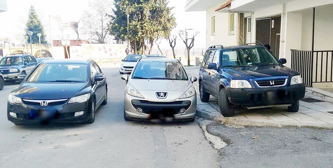 Όλων των λογιών τα παρκαρίσματα στην οδό Μπιζανίου στη Βέροια, χθες το μεσημέρι. Ένα νόμιμο (στο μέσον), ένα παράνομο με διπλό παρκάρισμα (αριστερά) και ένα παράνομο επί του πεζοδρομίου (δεξιά). Για να μην έχει… παράπονο κανένας, στην αγωνιώδη προσπάθεια εξεύρεσης θέσης στάθμευσης στο κέντρο της Βέροιας.