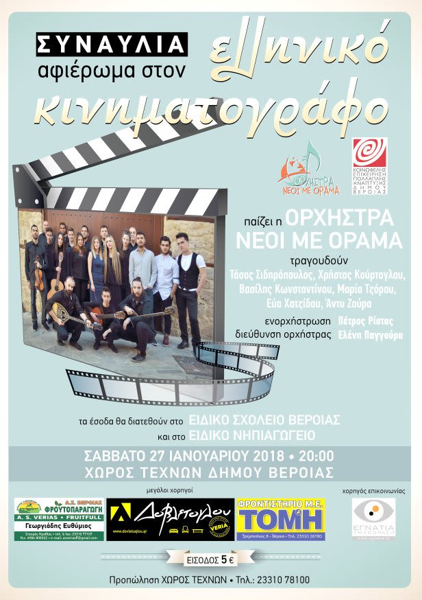 Η Ορχήστρα ‘’Νέοι Με Όραμα’’ σε συνεργασία με το Ειδικό Σχολείο Βέροιας, το Ειδικό Νηπιαγωγείο και την ΚΕΠΑ Δήμου Βέροιας συνδιοργανώνουν  συναυλία ‘’Αφιέρωμα στον Ελληνικό Κινηματογράφο’’, το Σάββατο 27/01/2018 στις 8.00μ.μ. στη Βέροια.