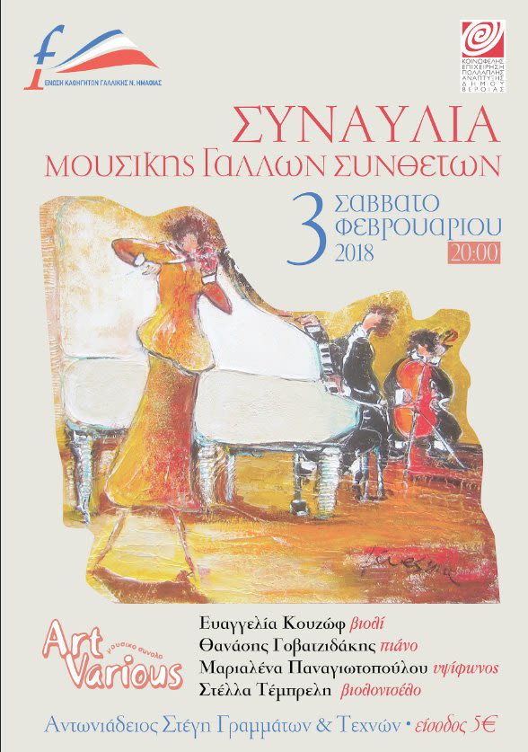 Η Ένωση Καθηγητών Γαλλικής Δημόσιας Εκπαίδευσης Ν.Ημαθίας και η ΚΕΠΑ Δήμου Βέροιας διοργανώνουν συναυλία μουσικής Γάλλων Συνθετών , με το σύνολο ART VARIOUS .