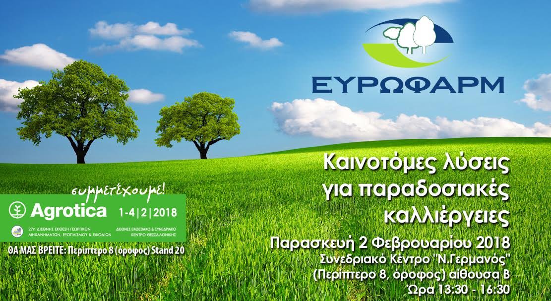 Παράλληλα, την Παρασκευή 2 Φεβρουαρίου και ώρα 13:30 στο πλαίσιο της 27ης Agrotica, η ΕΥΡΩΦΑΡΜ διοργανώνει ενημερωτική εκδήλωση με θέμα «Καινοτόμες λύσεις για παραδοσιακές καλλιέργειες», όπου θα συμμετέχουν διακεκριμένοι ομιλητές από την Ελλάδα και το εξωτερικό. Στόχος της εκδήλωσης είναι να αναδειχθούν οι τρόποι ποιοτικής και ποσοτικής βελτίωσης παραδοσιακών καλλιεργειών όπως το καλαμπόκι, ο ηλίανθος και η μηδική, αλλά και οι προοπτικές καλλιέργειας ελληνικών Φαρμακευτικών – Αρωματικών Φυτών.