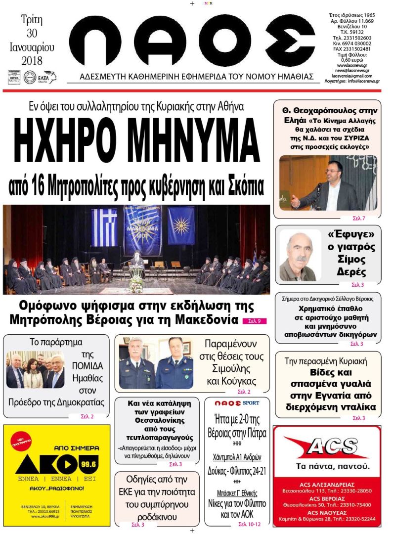 Πρωτοσέλιδο 30 Ιανουαρίου 2018 – Εφημερίδα ΛΑΟΣ