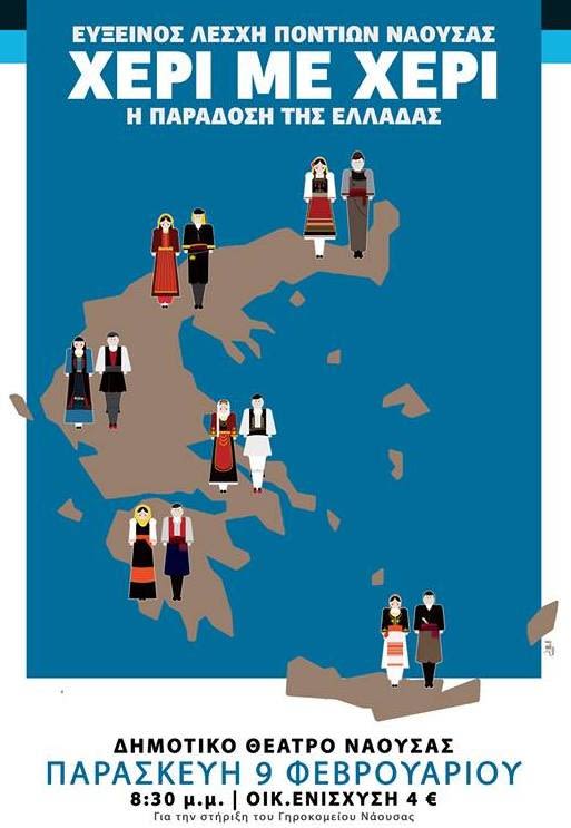 Με τα έσοδα για το Γηροκομείο Νάουσας οργανώνεται από την Εύξεινο Λέσχη Ποντίων Νάουσας η μουσικοχορευτική παράσταση «ΧΕΡΙ ΜΕ ΧΕΡΙ η παράδοση της Ελλάδας», που θα πραγματοποιηθεί την Παρασκευή 9 Φεβρουαρίου στις 8.30μμ στο δημοτικό θέατρο Νάουσας.