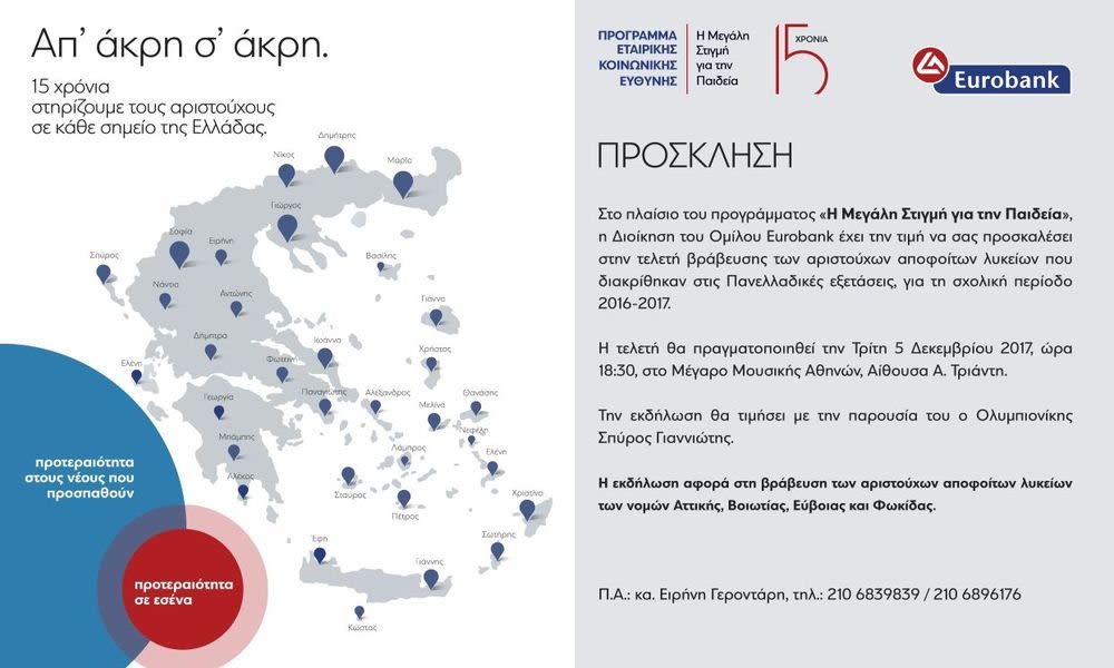 «Η Μεγάλη Στιγμή για την Παιδεία» αποτελεί το μακροβιότερο πρόγραμμα Εταιρικής Κοινωνικής Ευθύνης του ομίλου Eurobank, ο οποίος εδώ και χρόνια εστιάζει την κοινωνική του δράση στους τομείς της Παιδείας, της Κοινωνικής Αλληλεγγύης, της Καινοτομίας και της Νεανικής Επιχειρηματικότητας.