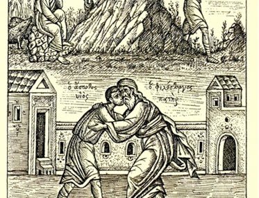«Εἶπε δέ· ἄνθρωπός τις εἶχε δύο υἱούς. καὶ εἶπεν ὁ νεώτερος αὐτῶν τῷ πατρί· πάτερ, δός μοι τὸ ἐπιβάλλον μέρος τῆς οὐσίας. καὶ διεῖλεν αὐτοῖς τὸν βίον. καὶ μετ᾿ οὐ πολλὰς ἡμέρας συναγαγὼν ἅπαντα ὁ νεώτερος υἱὸς ἀπεδήμησεν εἰς χώραν μακράν, καὶ ἐκεῖ διεσκόρπισε τὴν οὐσίαν αὐτοῦ ζῶν ἀσώτως. δαπανήσαντος δὲ αὐτοῦ πάντα ἐγένετο λιμὸς ἰσχυρὸς κατὰ τὴν χώραν ἐκείνην, καὶ αὐτὸς ἤρξατο ὑστερεῖσθαι. καὶ πορευθεὶς ἐκολλήθη ἑνὶ τῶν πολιτῶν τῆς χώρας ἐκείνης, καὶ ἔπεμψεν αὐτὸν εἰς τοὺς ἀγροὺς αὐτοῦ βόσκειν χοίρους. καὶ ἐπεθύμει γεμίσαι τὴν κοιλίαν αὐτοῦ ἀπὸ τῶν κερατίων ὧν ἤσθιον οἱ χοῖροι, καὶ οὐδεὶς ἐδίδου αὐτῷ. εἰς ἑαυτὸν δὲ ἐλθὼν εἶπε· πόσοι μίσθιοι τοῦ πατρός μου περισσεύουσιν ἄρτων, ἐγὼ δὲ λιμῷ ἀπόλλυμαι! ἀναστὰς πορεύσομαι πρὸς τὸν πατέρα μου καὶ ἐρῶ αὐτῷ· πάτερ, ἥμαρτον εἰς τὸν οὐρανὸν καὶ ἐνώπιόν σου. οὐκέτι εἰμὶ ἄξιος κληθῆναι υἱός σου· ποίησόν με ὡς ἕνα τῶν μισθίων σου. …»
