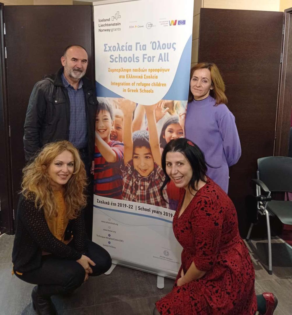 To έργο «Σχολεία για όλους – Συμπερίληψη Παιδιών Προσφύγων στα Ελληνικά Σχολεία» είναι ένα καινοτόμο, εθνικό τριετές πρόγραμμα με στόχο την ενίσχυση του σχολικού δημοκρατικού πολιτισμού. Προσφέρει επιστημονική επιμόρφωση και διαρκή υποστήριξη σε διευθυντές, διευθύντριες, εκπαιδευτικούς σχολείων και γονείς για θέματα που αφορούν τη δημοκρατική ιδιότητα του πολίτη, τη συμπερίληψη στο εκπαιδευτικό περιβάλλον και τα ανθρώπινα δικαιώματα. Φορέας υλοποίησης του έργου είναι το Ευρωπαϊκό Κέντρο Wergeland (EWC). Κατά τη διάρκεια του σχολικού έτους 2019-2020 συμμετείχαν στο πρόγραμμα μας 18 Γυμνάσια της Βόρειας και Νότιας Ελλάδας, στα οποία λειτουργούν ‘Τάξεις Υποδοχής’. Στόχος του προγράμματος αποτελεί να συμμετέχουν έως 150 σχολεία της Δευτεροβάθμιας Εκπαίδευσης με ‘Τάξεις Υποδοχής’ έως το τέλος του σχολικού έτους 2021-2022.