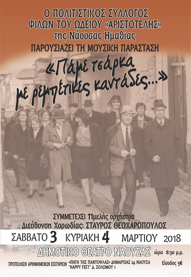 Κάλεσμα σε όλους απευθύνει η Μικτή Χορωδία Φίλων του Ωδείου “Αριστοτέλης”, να ακολουθήσουμε μαζί τα βήματα του νέου που κάτω απ’ το μπαλκόνι της αγαπημένης του θα της τραγουδήσει ρεμπέτικες καντάδες το Σάββατο 3 και την Κυριακή 4 Μαρτίου, ώρα 20.30 στο Δημοτικό Θέατρο Νάουσας.