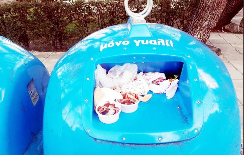 Η κάκιστη εικόνα στο κέντρο της Νάουσας, μπροστά στην είσοδο του πάρκου. Απορρίμματα από καφέδες, γλυκά, σάντουιτς, ακόμη και κουλούρια, πεταμένα στο στόμιο του κάδου ανακύκλωσης γυαλιού. Και να φανταστεί κανείς ότι μόλις δύο μέτρα δίπλα στον κάδο της φωτογραφίας υπάρχουν δύο καινούριοι υπόγειοι κάδοι, ένας για κανονικά σκουπίδια και ένας ανακύκλωσης!