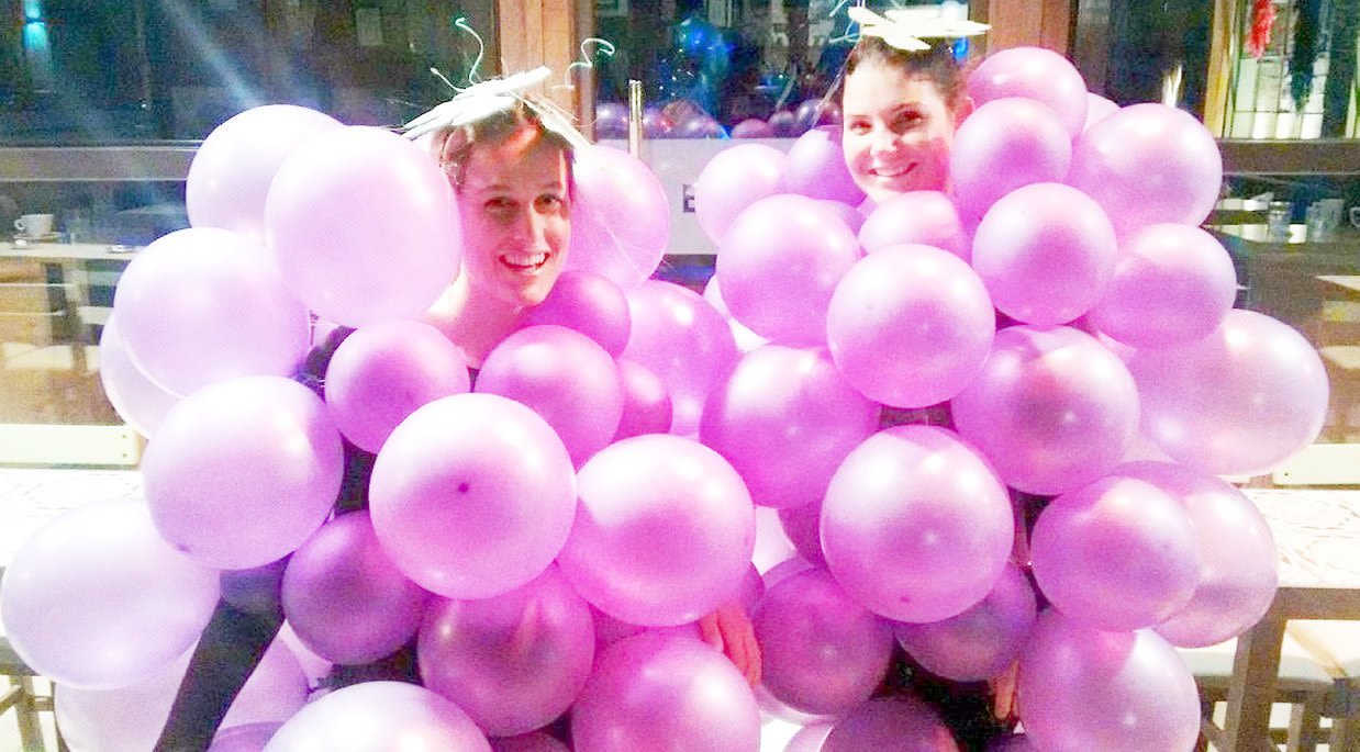 Ένα από τα ξεχωριστά γκρουπάκια καρναβαλιών στις πολλαπλές φετινές εκδηλώσεις της αποκριάς. Δυο πανέμορφα και χαμογελαστά… τσαμπιά σταφύλι, καλυμμένα με μοβ μπαλόνια, ντόπια παραγωγή παρακαλώ,… ξινόμαυρο 2004, όπως μας είπαν με κέφι και εμφανή γνώση του αντικειμένου. Καλά κρασιά!