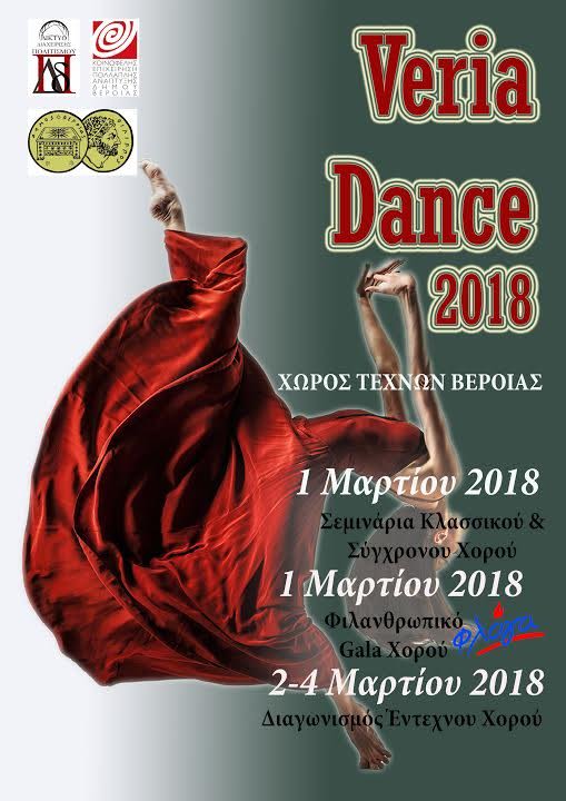 Το «Δίκτυο Διαχείρισης Πολιτισμού» σε συνεργασία με την «Κοινωφελή Επιχείρηση Πολλαπλής Ανάπτυξης Βέροιας» και τον Δήμο Βέροιας παρουσιάζουν τη διοργάνωση «Veria Dance 2018», η οποία θα πραγματοποιηθεί στο Χώρο Τεχνών Βέροιας στις 1-2-3 και 4 Μαρτίου. Η Βέροια φιλοξενεί την πανελλήνια αυτή «γιορτή» του χορού και πρόκειται για μια τριπλή διοργάνωση, η οποία αποτελείται από τα «Veria Dance Seminars», το «Veria Dance Gala» και τον «Veria Dance Competition». Όλη η Ελλάδα θα συναντηθεί στη Βέροια, καθώς έχει ήδη εκδηλωθεί ενδιαφέρον εκτός από σχολές χορού της περιοχής και από Θεσσαλονίκη, Αθήνα, Βόλο, Δράμα, Τρίκαλα, Καβάλα, Κρήτη, κ.α..