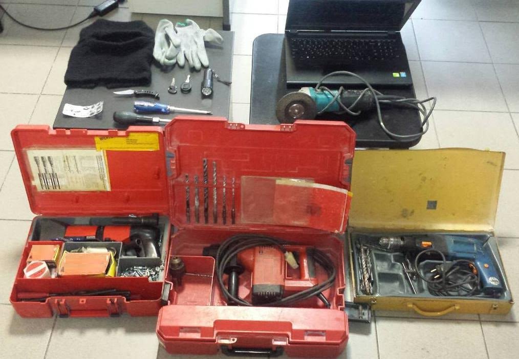 Επιπλέον στην κατοχή του βρέθηκαν και κατασχέθηκαν διαρρηκτικά εργαλεία, κλειδιά αυτοκινήτου, ένα ζευγάρι γάντια, μία κουκούλα και ένας φακός.