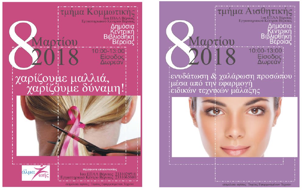 Την Πέμπτη 8 Μαρτίου 2018, “Ημέρα της Γυναίκας”, από τις 10:00 έως 13:00, μαθητές και εκπαιδευτικοί της ειδικότητας Αισθητικής του 1ου ΕΠΑΛ Βέροιας, σας περιμένουν στην Δημόσια Κεντρική Βιβλιοθήκη Βέροιας, όπου θα προσφέρουν δωρεάν: εφαρμογή ενυδάτωσης και ειδικών τεχνικών μάλαξης και βελτίωσης της εικόνας του προσώπου, παράλληλα με μυϊκή χαλάρωση και ευεξία, θεμέλιο λίθο της προληπτικής φροντίδας της υγείας και ολιστικής υγιεινής.