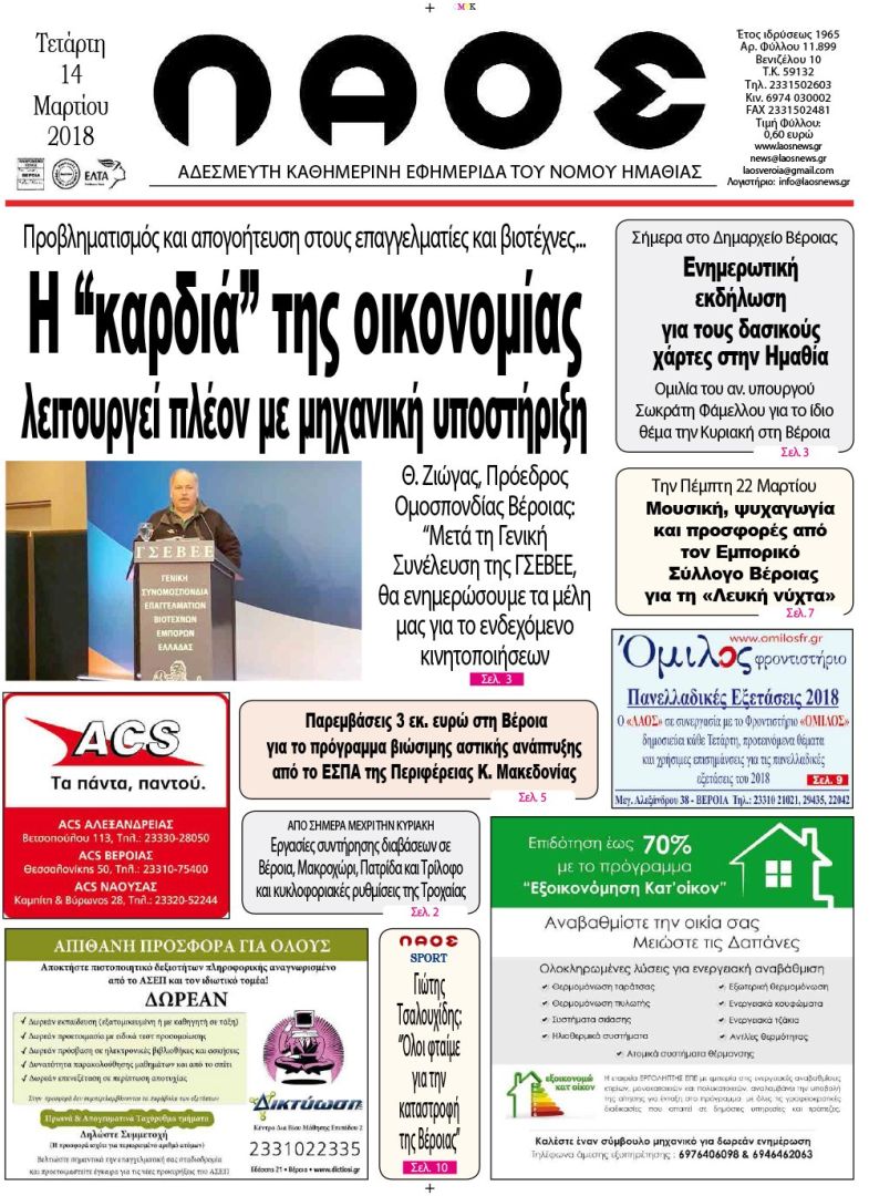 Πρωτοσέλιδο 14 Μαρτίου 2018