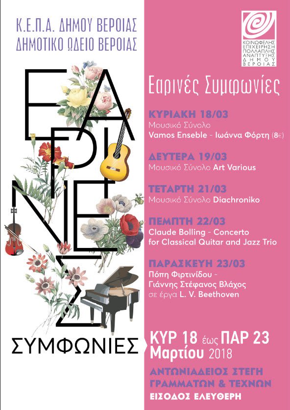 Η ΚΕΠΑ Δήμου Βέροιας και το Δημοτικό ωδείο Βέροιας διοργανώνουν από την Κυριακή 18 Μαρτίου μέχρι την Παρασκευή 23 Μαρτίου 2018 συναυλίες Μουσικής με τίτλο Εαρινές Συμφωνίες στην Αντωνιάδειο Στέγη Γραμμάτων και Τεχνών και στο Χώρο Τεχνών. Η είσοδος στις συναυλίες μουσικής δωματίου στην Αντωνιάδειο Στέγη θα είναι ελεύθερη ενώ στη συναυλία που θα πραγματοποιηθεί στο Χώρο Τεχνών με το Μουσικό Σύνολο Vamos Enseble -Ιωάννα Φόρτη θα είναι 8€ (για τους μαθητές Ωδείων και του μουσικού Σχολείου 4€).