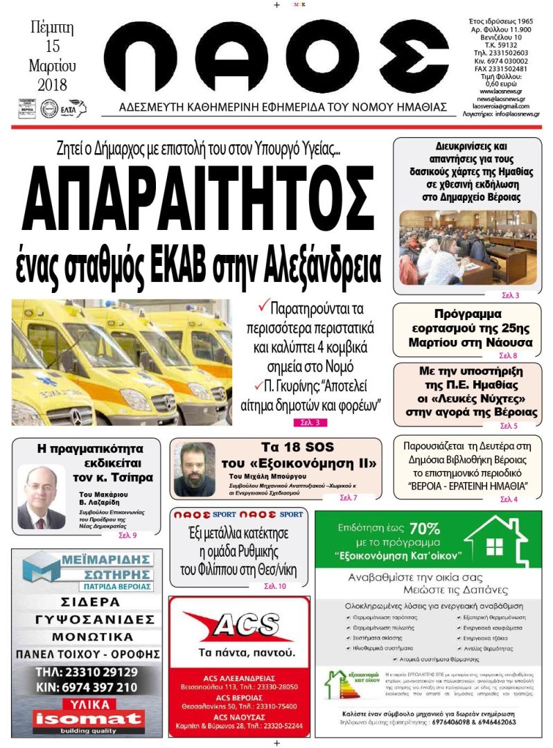 Πρωτοσέλιδο 15 Μαρτίου 2018