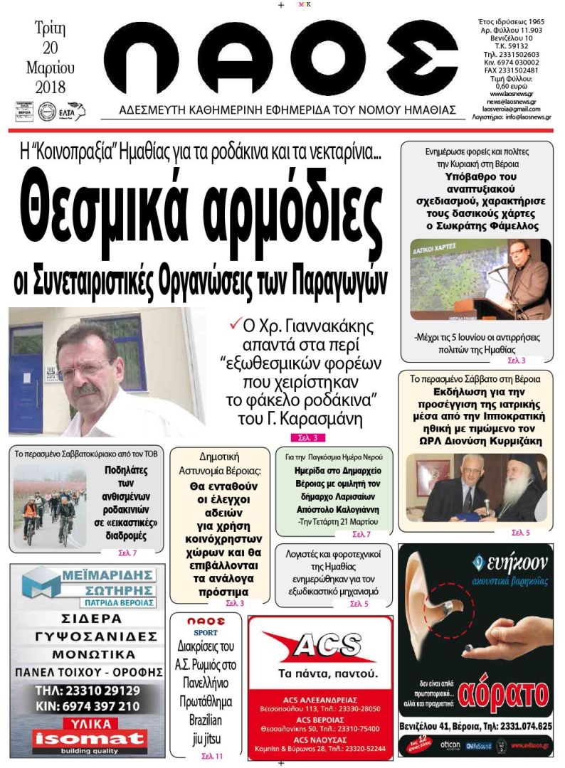 Πρωτοσέλιδο 20 Μαρτίου 2018