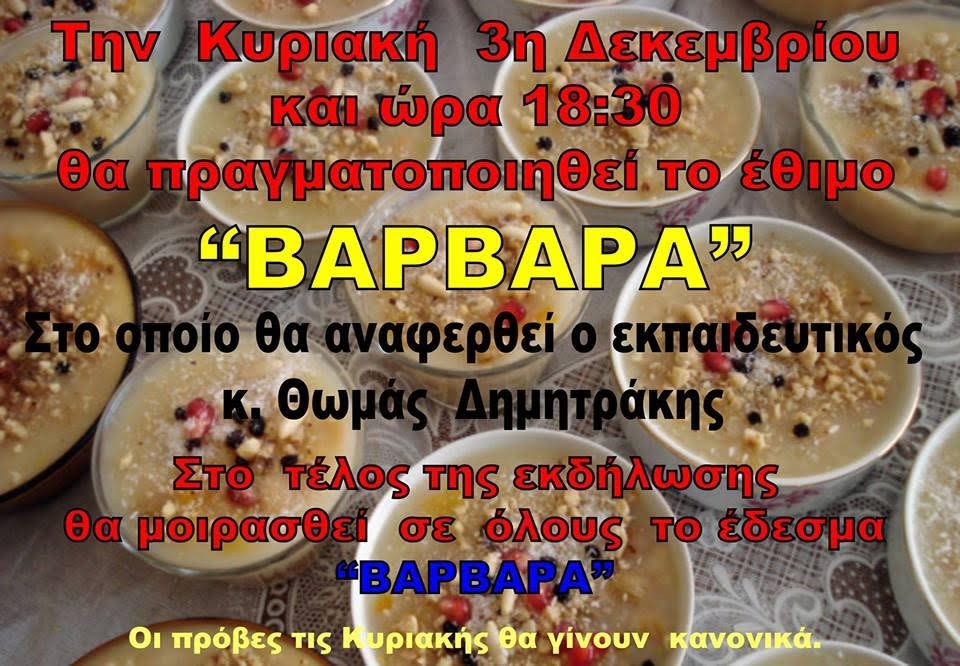 Την ερχόμενη Κυριακή 3 Δεκεμβρίου στις 6.30 το απόγευμα θα πραγματοποιηθεί όπως κάθε χρόνο στα γραφεία της Θρακικής Εστίας Βέροιας (οδός Κυριωτίσσης 3Α) το θρακιώτικο έθιμο της Βαρβάρας. Για το έθιμο θα αναφερθεί ο εκπαιδευτικός Θωμάς Δημητράκης, ενώ μετά το τέλος της ομιλίας θα μοιρασθεί σε όλους η πατροπαράδοτη θρακιώτικη «Βαρβάρα».