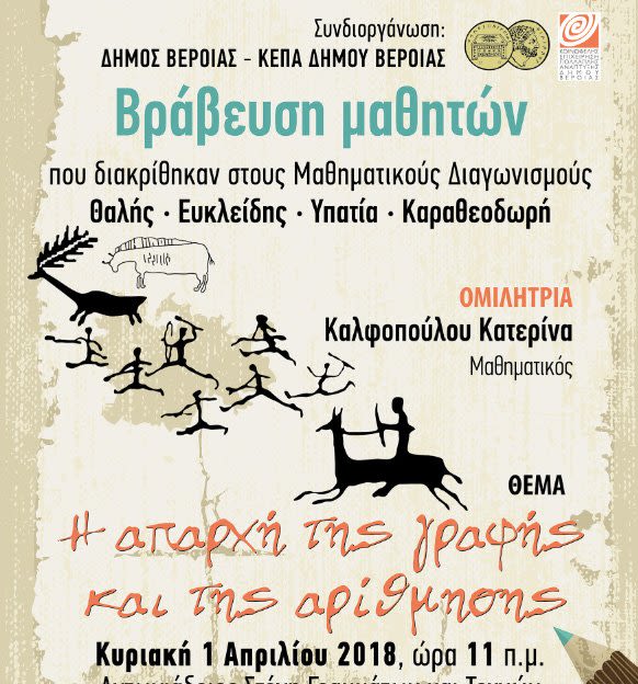 Το Παράρτημα Ημαθίας της Ελληνικής Μαθηματικής Εταιρείας βραβεύει τους μαθητές, που διακρίθηκαν στους Μαθηματικούς Διαγωνισμούς «Θαλής», «Ευκλείδης», «Αρχιμήδης», «Υπατία» και «Καραθεοδωρή», την Κυριακή 1 Απριλίου 2018 και ώρα 11:00 πμ στην Αντωνιάδειος Στέγη Γραμμάτων και Τεχνών Δήμου Βέροιας.