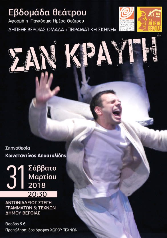 H ομάδα «Πειραματική Σκηνή» του Τμήματος Θεατρικής Υποδομής του ΔΗ.ΠΕ.ΘΕ. Βέροιας παρουσιάζει την παράσταση «Σαν Κραυγή» σε σκηνοθεσία Κώστα Αποστολίδη, στο πλαίσιο της «Εβδομάδας Θεάτρου 2018». Η παράσταση θα δοθεί το Σάββατο 31 Μαρτίου 2018, ώρα 8.30μ.μ. στην Αντωνιάδειο Στέγη Γραμμάτων & Τεχνών με γενική είσοδο 5€.