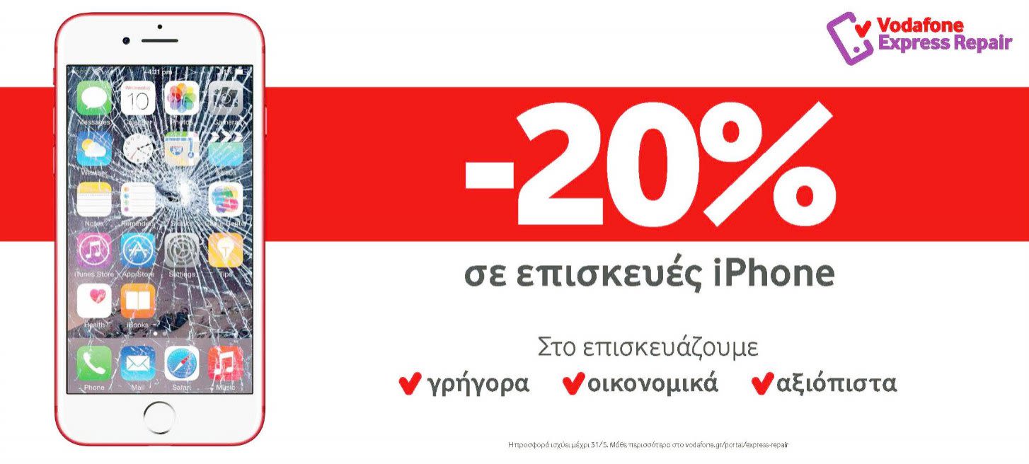 Η Vodafone μέσω της υπηρεσίας Vodafone Express Repair, δίνει σε όλους τη δυνατότητα να επισκευάσουν την iPhone συσκευή τους με έκπτωση  20% μέσα σε 24 ώρες, οικονομικά και αξιόπιστα.