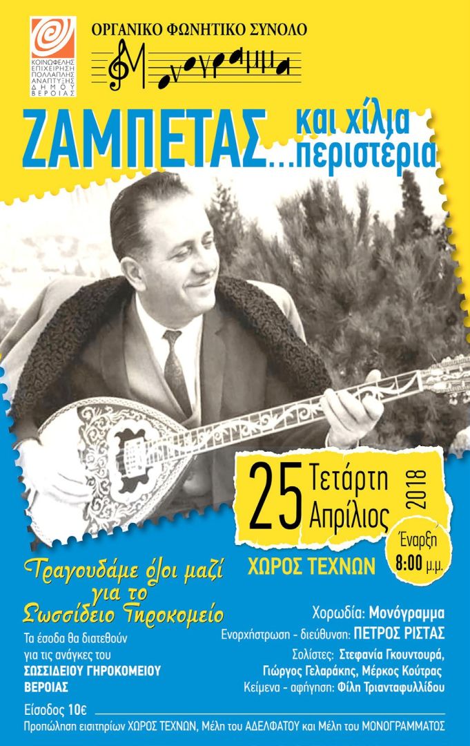 Μουσική συναυλία-αφιέρωμα στον Γιώργο Ζαμπέτα θα πραγματοποιηθεί από το Γυναικείο Οργανικό Φωνητικό Σύνολο «Μονόγραμμα» για την οικονομική ενίσχυση του Σωσσίδειου Γηροκομείου Βέροιας. Η εκδήλωση θα γίνει την Τετάρτη 25 Απριλίου 2018, στις 8.00 μμ, στον Χώρο Τεχνών Βέροιας.