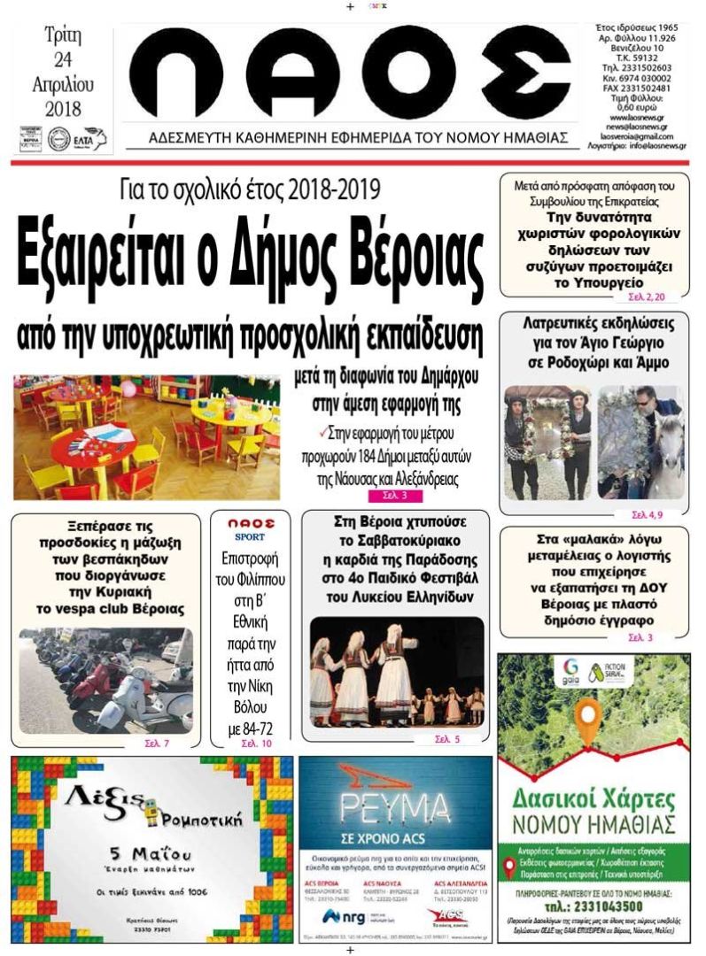 Εξαιρείται ο Δήμος Βέροιας από την υποχρεωτική προσχολική εκπαίδευση μετά τη διαφωνία του Δημάρχου στην άμεση εφαρμογή της