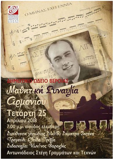 Μια ιδιαίτερη συναυλία θα πραγματοποιηθεί από δύο τμήματα του Δημοτικού Ωδείου Βέροιας, σήμερα Τετάρτη 25 Απριλίου 2018 στη Στέγη Γραμμάτων και Τεχνών στις 7.00 μμ.