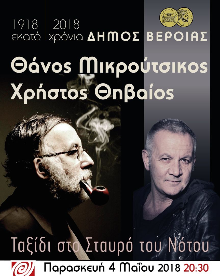 και αγαπημένος συνθέτης και στιχουργός Θάνος Μικρούτσικος μαζί με τον συνθέτη και τραγουδιστή Χρήστο Θηβαίο έρχονται  στη Βέροια , στο Χώρο Τεχνών  για να μας ταξιδέψουν στο Σταυρό του Νότου ,σε μια συναυλία
