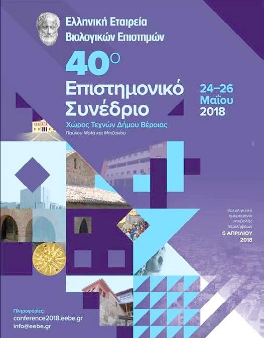 Το 40ο συνέδριο της Ελληνικής Εταιρείας Βιολογικών Επιστημών (ΕΕΒΕ) διοργανώνεται στην Βέροια, στον Χώρο Τεχνών, από 24 έως 26 Μαΐου 2018. Διακεκριμένοι ερευνητές από την Ελλάδα και το εξωτερικό θα αναπτύξουν ένα ευρύ φάσμα θεμάτων που άπτονται όλων των πεδίων της Βιολογίας.