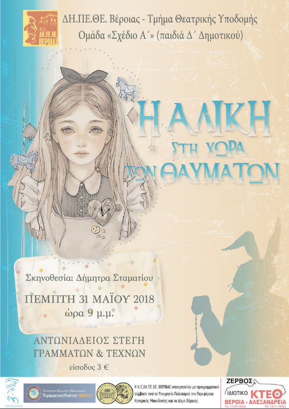 Η Ομάδα «Σχέδιο Α’» (παιδιά Δ’ Δημοτικού) του Τμήματος Θεατρικής Υποδομής του ΔΗ.ΠΕ.ΘΕ. Βέροιας παρουσιάζουν την παράσταση “Η Αλίκη στη Χώρα των Θαυμάτων”, του Λιούις Κάρολ σε διασκευή και σκηνοθεσία Δήμητρας Σταματίου. Η παράσταση θα δοθεί σήμερα Πέμπτη 31 Μαΐου 2018 στις 9.00μ.μ. στην Αντωνιάδειο Στέγη Γραμμάτων & Τεχνών, με γενική είσοδο 3€.