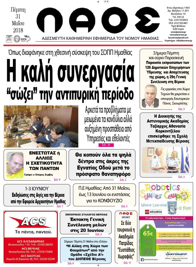 Πρωτοσέλιδο 31 Μαΐου 2018