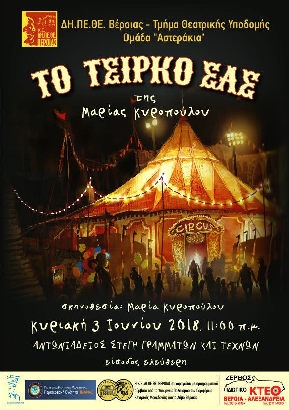 H Ομάδα «Αστεράκια» του Τμήματος Θεατρικής Υποδομής του ΔΗ.ΠΕ.ΘΕ. Βέροιας παρουσιάζει την παράσταση «Το τσίρκο σας» της Μαρίας Κυροπούλου, σε σκηνοθεσία της Μαρίας Κυροπούλου. Η παράσταση θα δοθεί την Κυριακή 3 Ιουνίου 2018 στις 11.00π.μ. στην Αντωνιάδεια Στέγη Γραμμάτων & Τεχνών στη Βέροια, με ελεύθερη είσοδο.