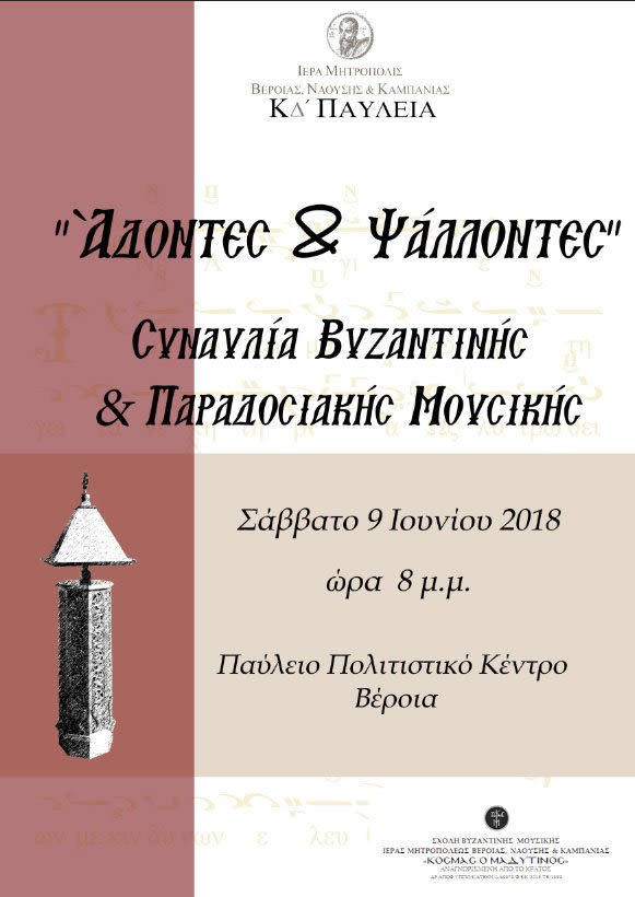 Το Ωδείο της Ιεράς Μητροπόλεως Βεροίας, Ναούσης & Καμπανίας, στα πλαίσια των ΚΔ’ ΠΑΥΛΕΙΩΝ διοργανώνει μαθητική επίδειξη με τίτλο «Άδοντες & Ψάλλοντες» η οποία θα πραγματοποιηθεί το Σάββατο 9 Ιουνίου 2018 και ώρα 8 μ.μ. στο Παύλειο Πολιτιστικό Κέντρο – Βέροια.